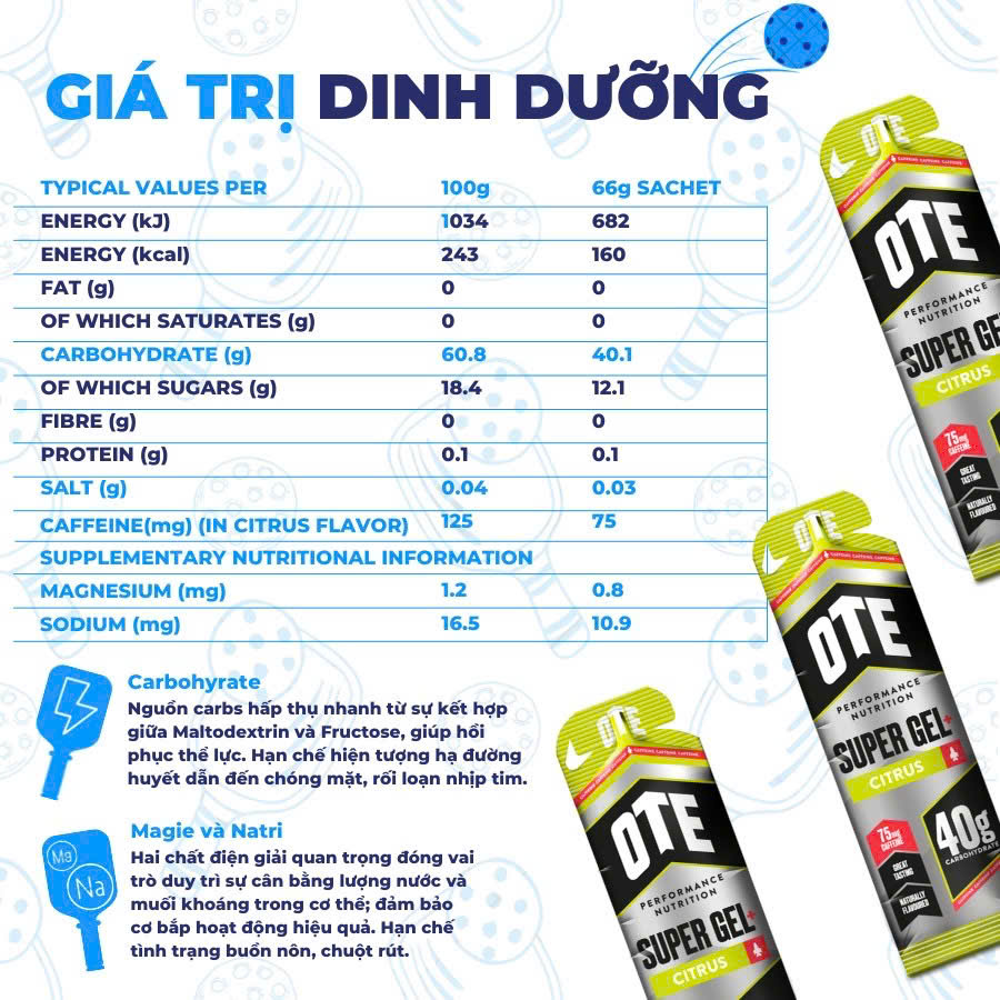 • Điện giải cân bằng: OTE Super Gel chứa điện giải với tỷ lệ cân bằng, hỗ trợ hấp thu nước và duy trì mức độ hydrat hoá trong quá trình tập luyện.